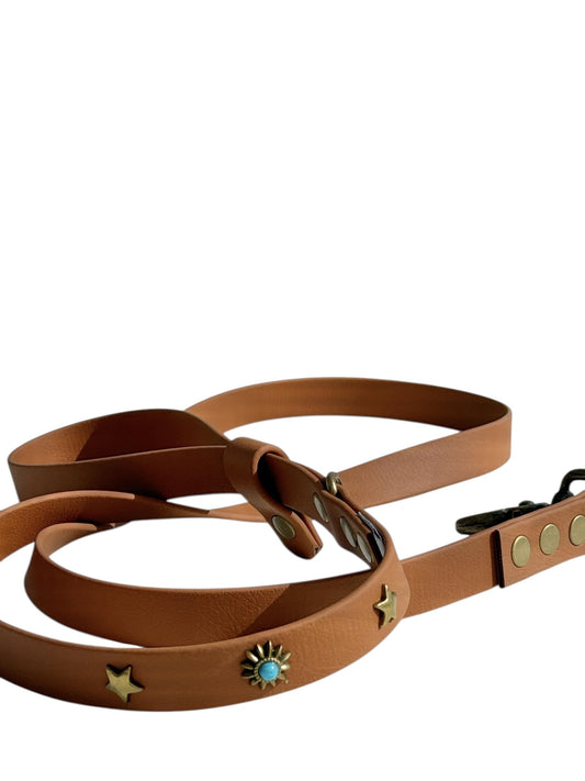 Λουρί Biothane – Powder Tan με Χρυσά Αστεράκια & Τιρκουάζ Τρουκς