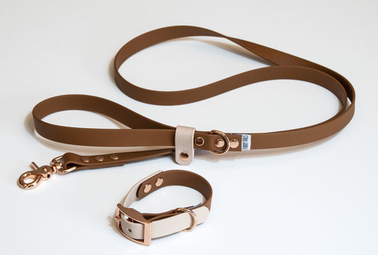 Δίχρωμο Περιλαίμιο Biothane σε Μπεζ και Καφέ με Ροζ Χρυσά μεταλλικά αξεσουάρ