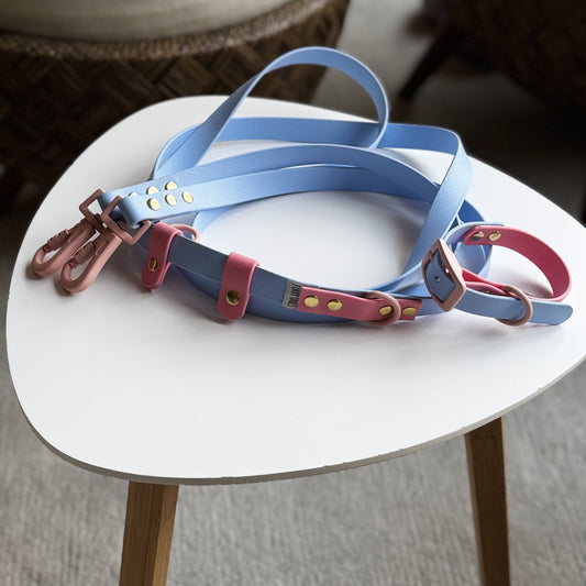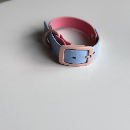 Δίχρωμο Περιλαίμιο Biothane Παστέλ Ροζ & Γαλάζιο -με παστέλ ροζ αξεσουάρ