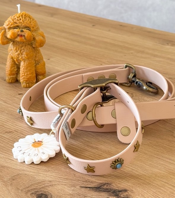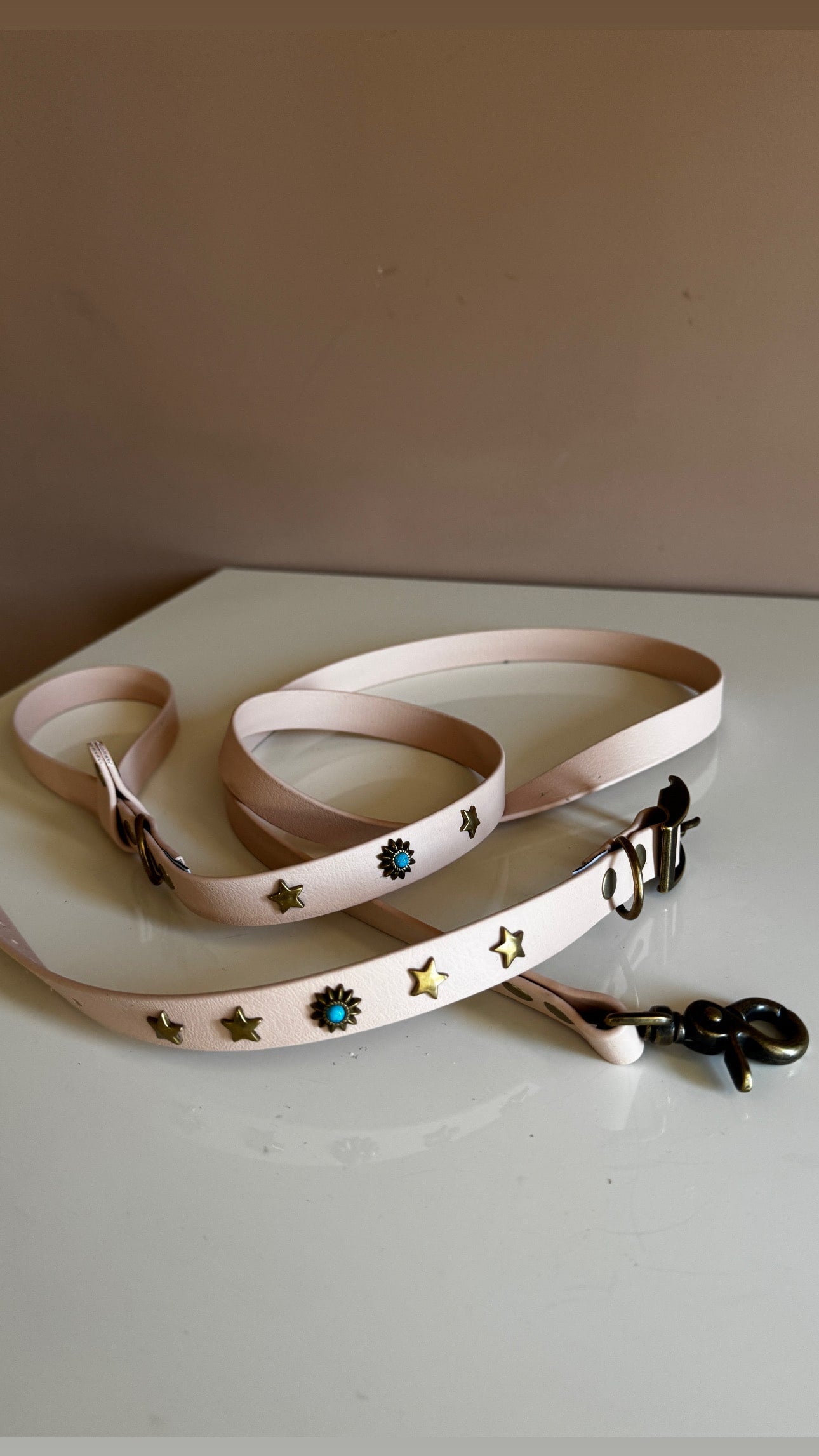 Στυλάτο και αξιόπιστο, το λουρί σε απαλό ροζ Biothane συνδυάζει την ίδια boho αισθητική με χρυσά αστεράκια και τιρκουάζ διακοσμητικά. Άνετο στο κράτημα και εξαιρετικά ανθεκτικό, είναι η ιδανική επιλογή για τις καθημερινές σας βόλτες με έξτρα στυλ.