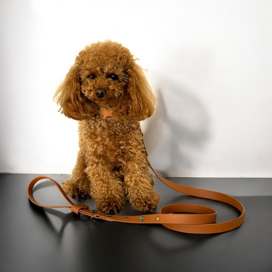 Designed to stand out with subtle elegance, this brown Biothane leash brings together durability, comfort, and a decorative twist. Adorned with metallic star studs and a signature sunburst-style centerpiece with a turquoise stone, it’s the perfect match to its coordinating collar—eye-catching, yet understated.