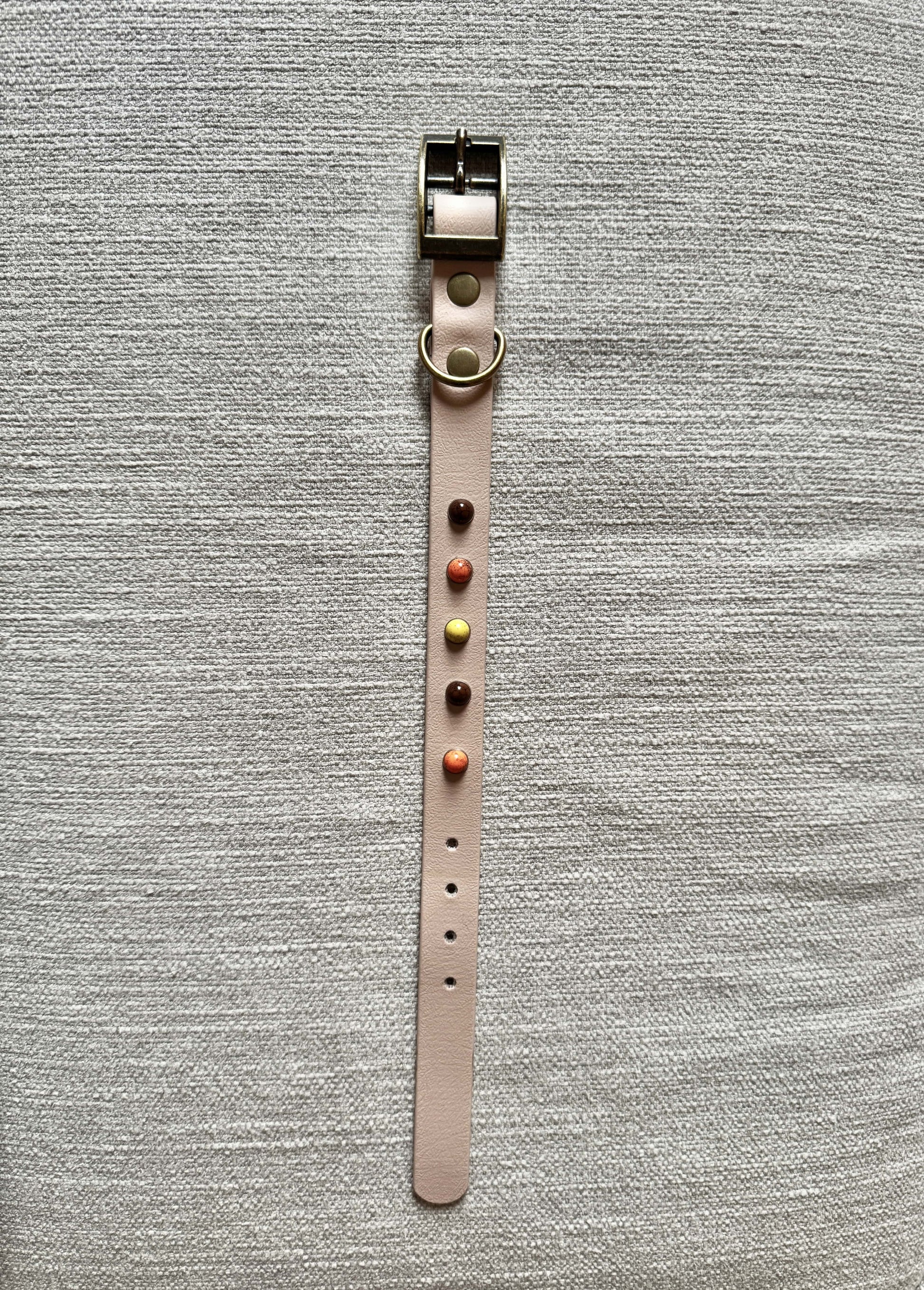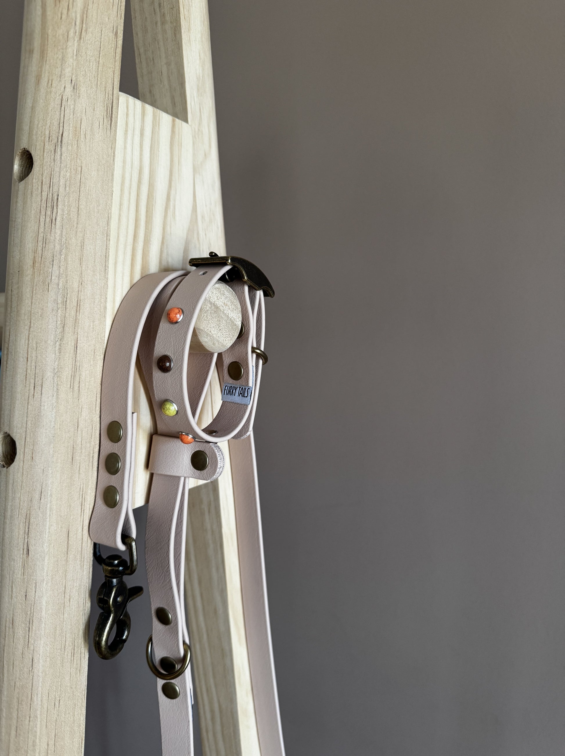 Elevate your pup’s style with our Powder Tan Biothane Collar, adorned with playful multicolor studs for a pop of personality. This chic accessory isn’t just beautiful—it’s built to last. Crafted from premium Biothane, it offers the luxurious look of leather with unmatched durability, weather resistance, and easy maintenance. Whether you're heading out for a casual stroll or a special outing, this collar ensures your dog stays both stylish and secure.